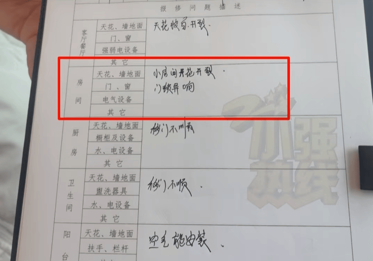 & T! K- m; b( z2 Y0 A/ e 工作人员说:“那两面墙的空鼓,当时没有写出来,但我们工程部在查验的时候发现了问题,工程部也出于好心,想给客户修复。” 7 Q# C5 h; v9 r