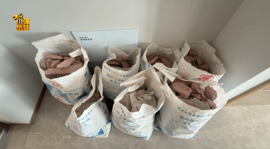 5 D( D7 h# ^+ Y, B- ^+ N 记者在现场看到,钟女士家有两面墙表面已经被破坏,露出里面红色的砖体结构,入户门口,还整齐地摆放着六个袋子,里面都是被砸下来的砖块。